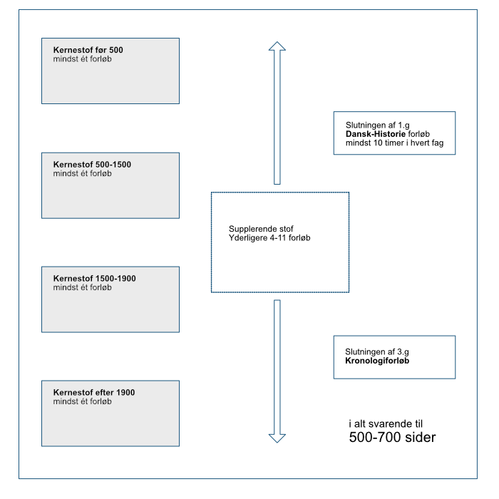 Forløbene skal tilrettelægges så mindst to forløb tager udgangspunkt i Danmarks historie, og mindst ét forløb tager udgangspunkt i samfund og kulturer uden for Europa og USA.